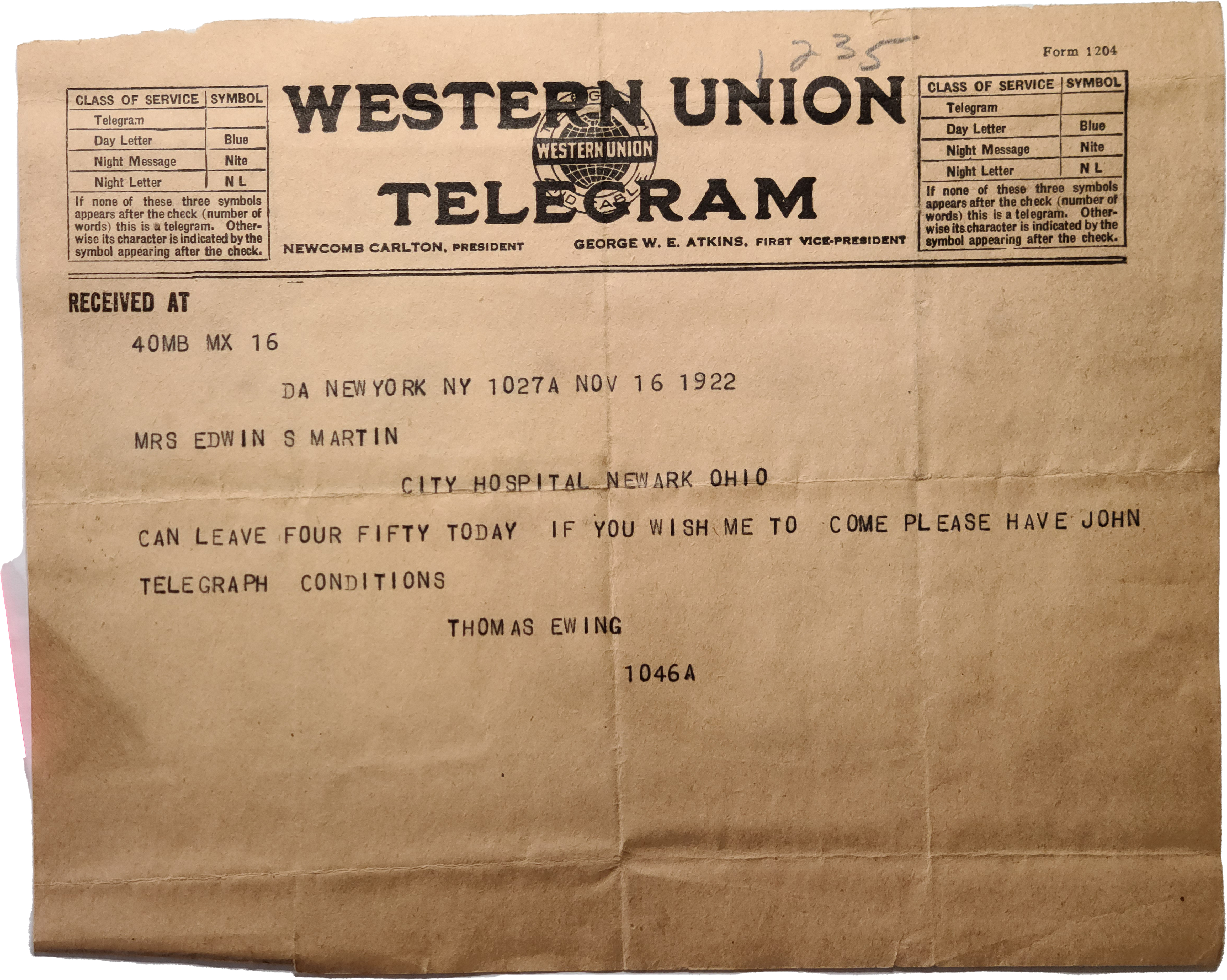 Telegram to Mrs. Edwin S Martin from Thomas Ewing Jr – Death of Edwin S. Martin Sr.